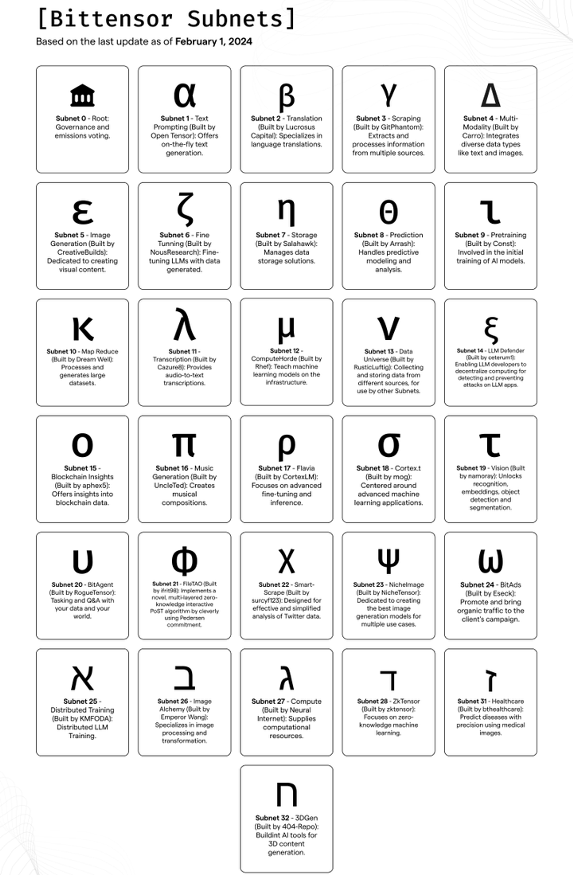 Bittensor works in a very unique way - it is split up into a bunch of smaller networks, or subnets, where each subnet operates individually and is responsible for a specific aspect of AI modeling. For example, Subnet 1 is responsible for text prompting, Subnet 7 is responsible for storage solutions, and Subnet 27 is responsible for computing. Subnet 0 acts as the main subnet of the network and is responsible for all of the governance aspects of the Bittensor network. All the subnets work together to create a censorship resistant, open source, and community owned AI modeling system that is available for anyone to use.