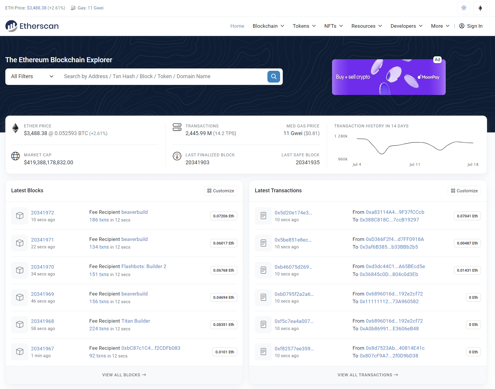 Etherscan is Ethereum’s blockchain explorer and gives users real time information on the state of the network. Users are able to view blocks and their transactions, public addresses, smart contracts, current gas metrics, and all the other data taken directly from the network.