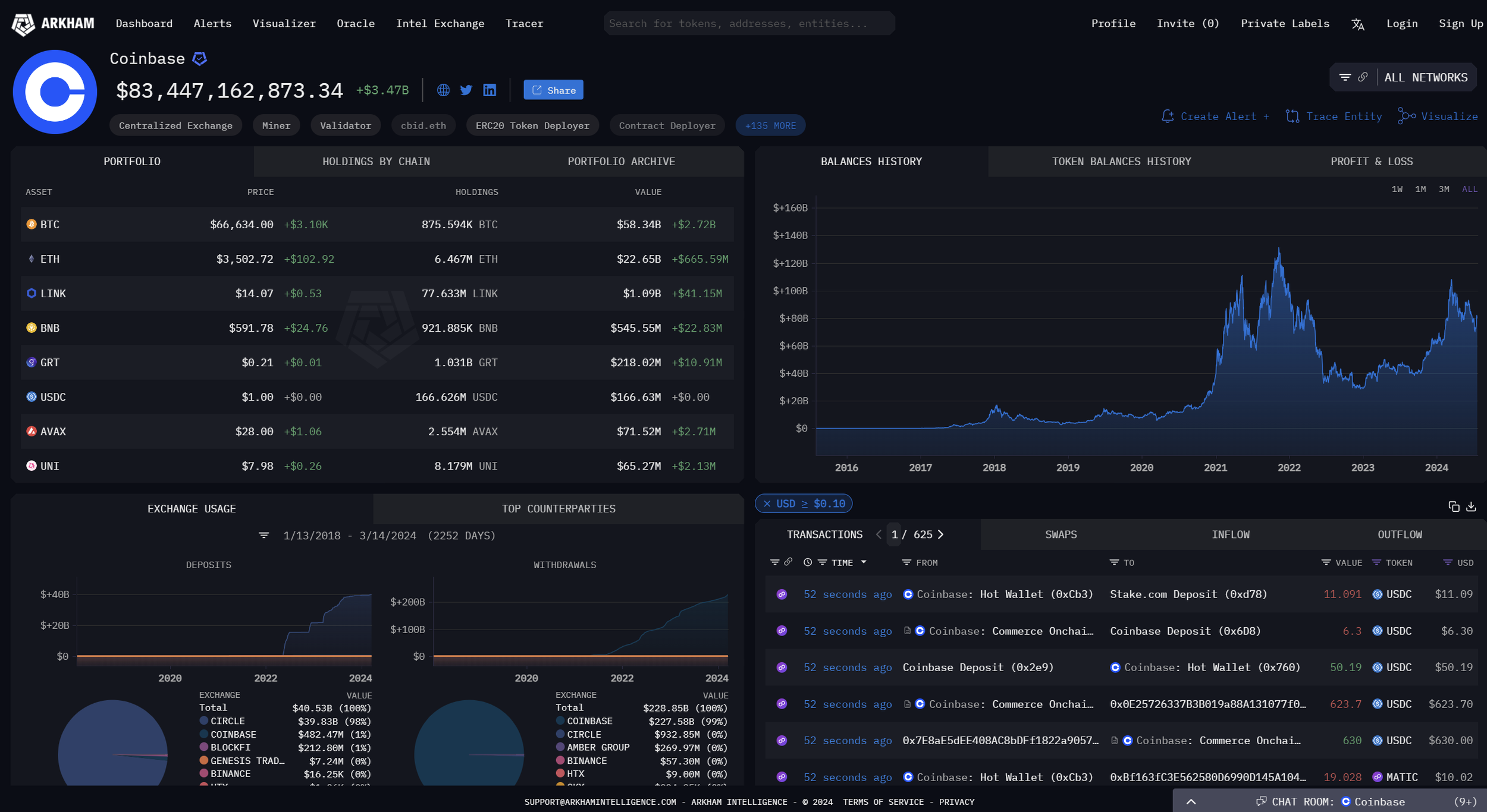 Arkham is able to trace tons of information regarding any on-chain address including a complete list of transactions, all of the wallet’s holdings, usage metrics, and more. It also allows users to create custom dashboards to track different addresses. For example, searching for Coinbase will reveal this dashboard that contains all of the metrics given about the exchange. Arkham is able to determine the true owners of on-chain addresses by tracking the movements of funds from known wallets and creating a trail from that address’s transactions.