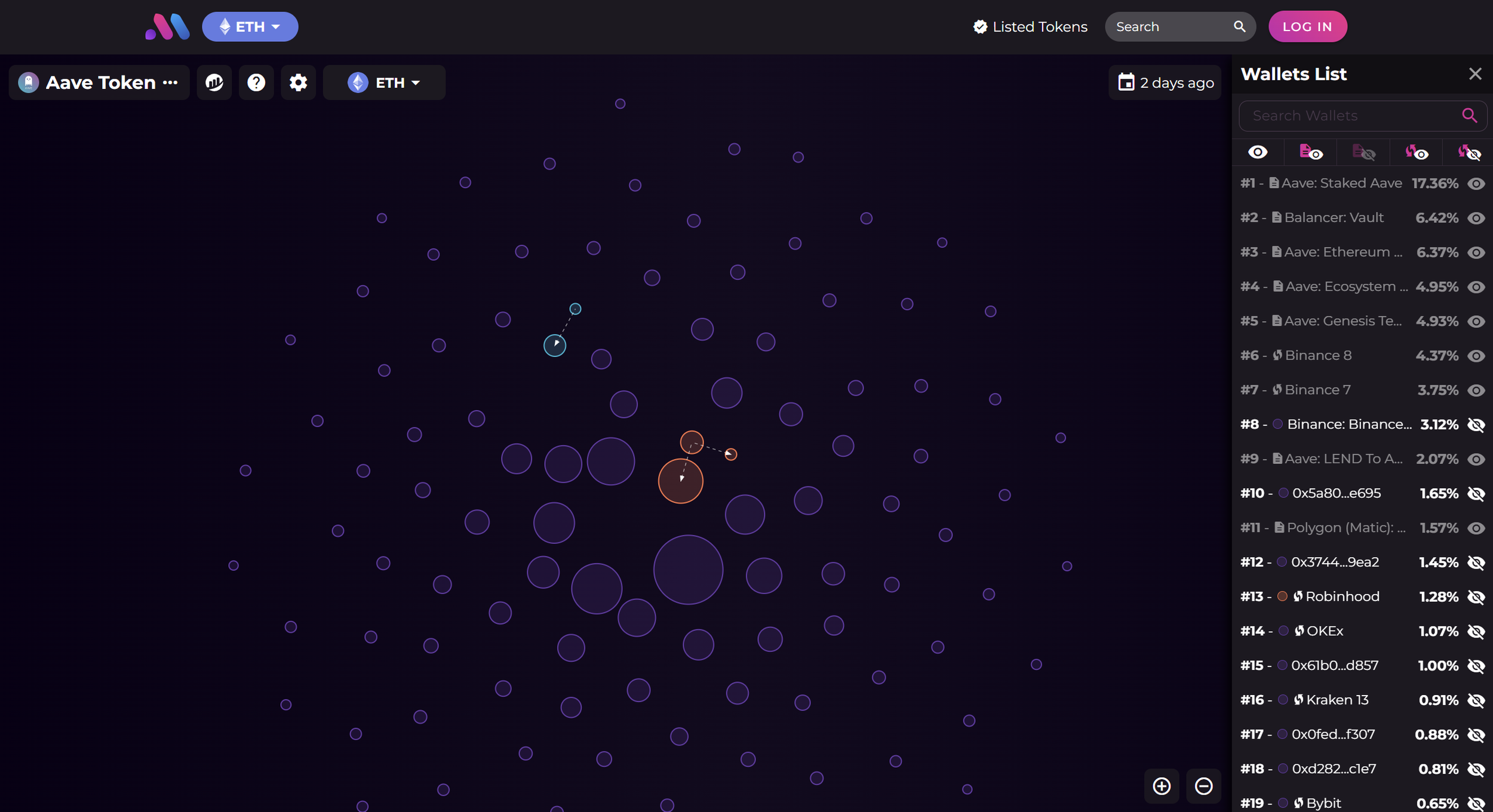 Arkham also offers tons of data visualization options for users to utilize to better organize the data into a more readable format. This system goes hand-in-hand with Bubblemaps, another wallet tracking site that offers users a less in-depth and more visually appealing platform to track addresses. Bubblemaps works by creating an interactive bubble map to illustrate addresses and their token holdings. This lets users literally see token distribution patterns, as well as identify linked wallets, and who holds what percentage of the supply.