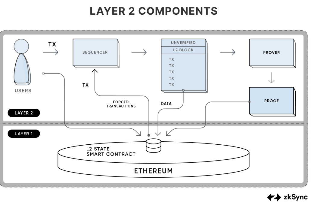 - Users submit their transactions to the ZKsync sequencer, which creates the blocks on the L2