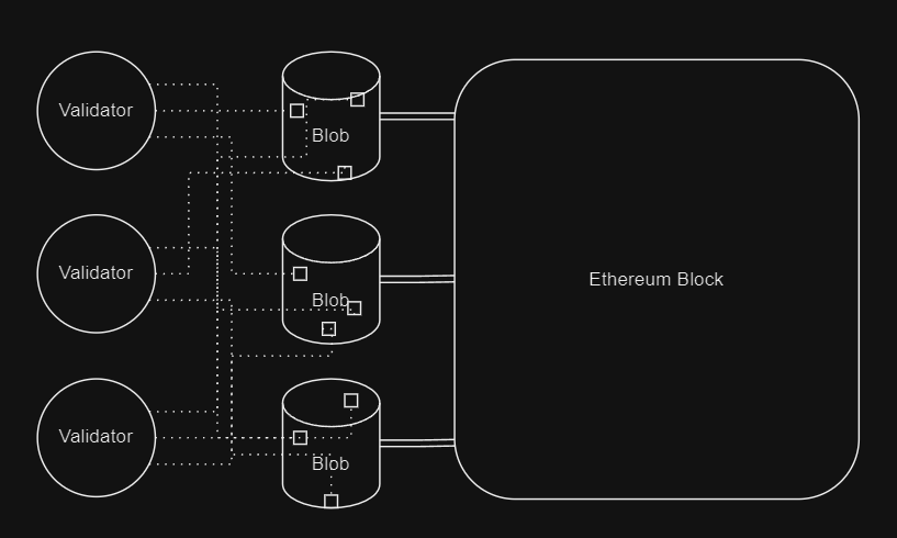 - The validators will all sample random parts of each blob to verify that all transactions are valid. Once the validators verify the data from the blobs to be accurate, the new block is added onto the blockchain.
