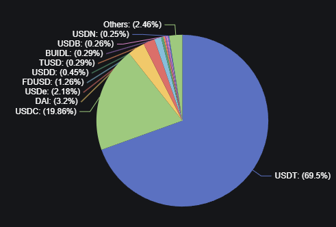 The largest stablecoin by market share is USDT, operated by Tether. USDT is entirely backed by the US dollar as well as government bonds and treasury notes. It dominates almost 70% of the stablecoin market with its closest competitor USDC, ran by Circle, making up 20% of the stables market. Other popular stablecoins include the DAI token by Maker, the USDe token ran by Ethena, and the PYUSD token operated by PayPal. Euro versions exist as well, with Circle operating EURC as a Euro stablecoin solution.